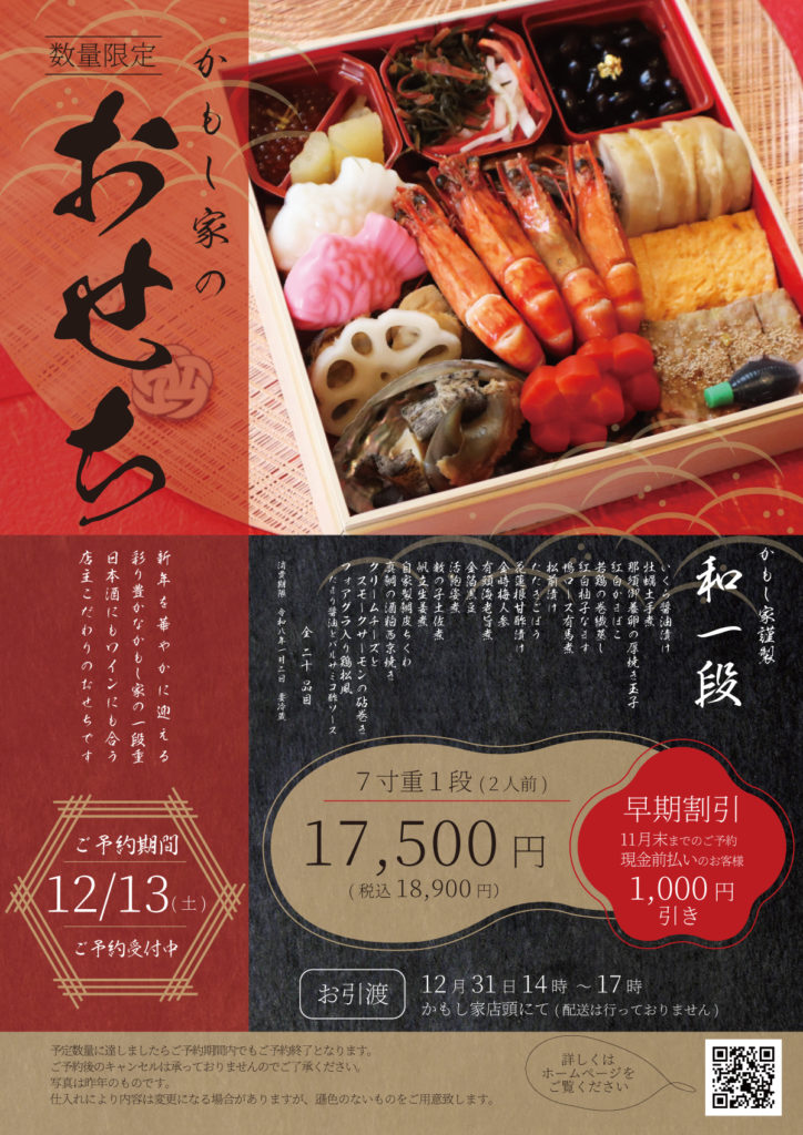 かもし家のおせちも現在、ご予約受付中です。