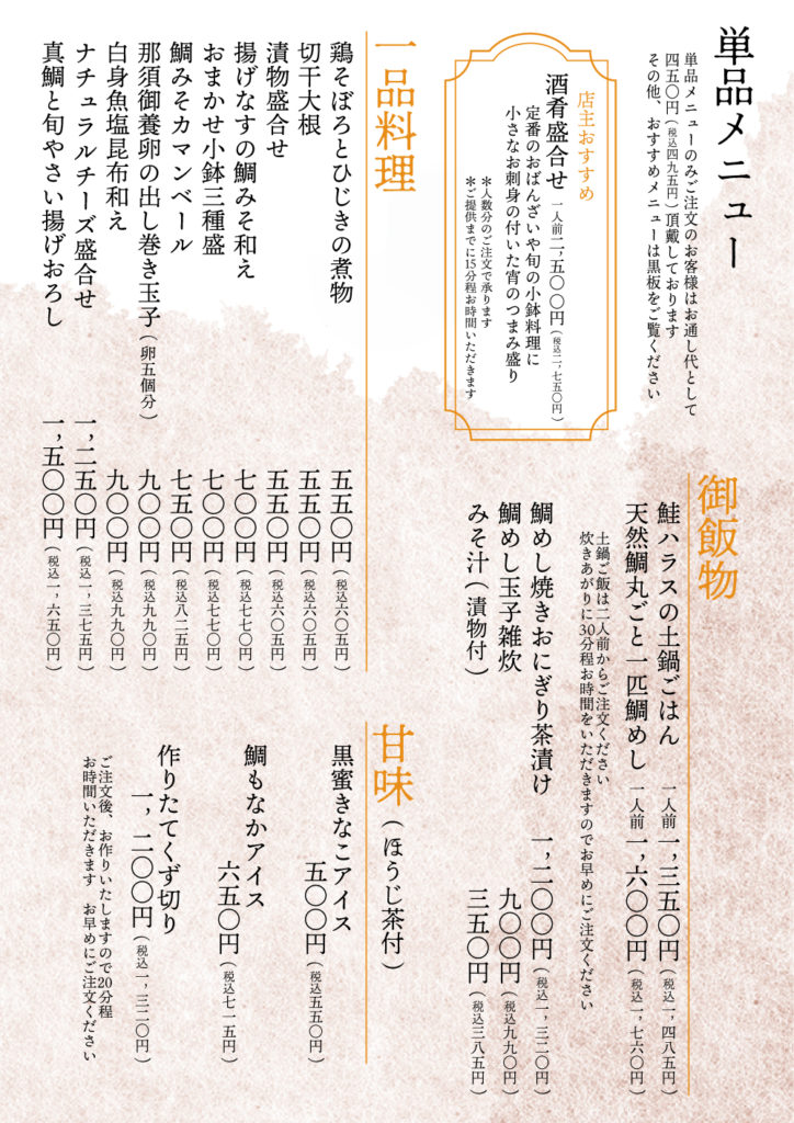 これまでの酒肴のコース・鯛めしのコースから
